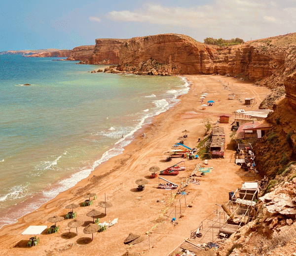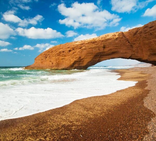 We'll depart from Taroudant heading south, passing through Tafraoute, a Berber trading town surrounded by pinkish granite rocks and home to numerous well-preserved old houses. We'll continue to Legzira Beach, a natural wonder with its two stone arches, created by erosion. We'll visit the beach and continue the route to Agadir, where we'll spend the night.