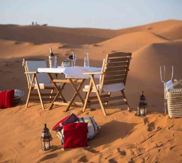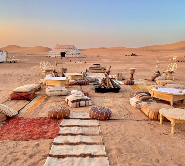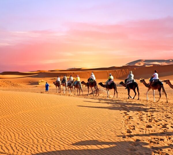 Departure for Merzouga, passing through the Todra Gorges, where we can enjoy a beautiful walk following the course of the river, observing its small waterfalls. This is a popular area for climbers seeking new sensations. We will pass through the Tinghir palm grove, where we will see the impressive contrast between its lush vegetation and the arid surrounding landscape, until we reach the city of Erfoud, a paradise for fossil hunters, as the area was once covered by water. It is also known for the discovery of several dinosaur bones. From Erfoud, we will head to Merzouga, in the desert, where we will take the dromedaries that will take us into the dunes and spend the night in a typical Berber tent.